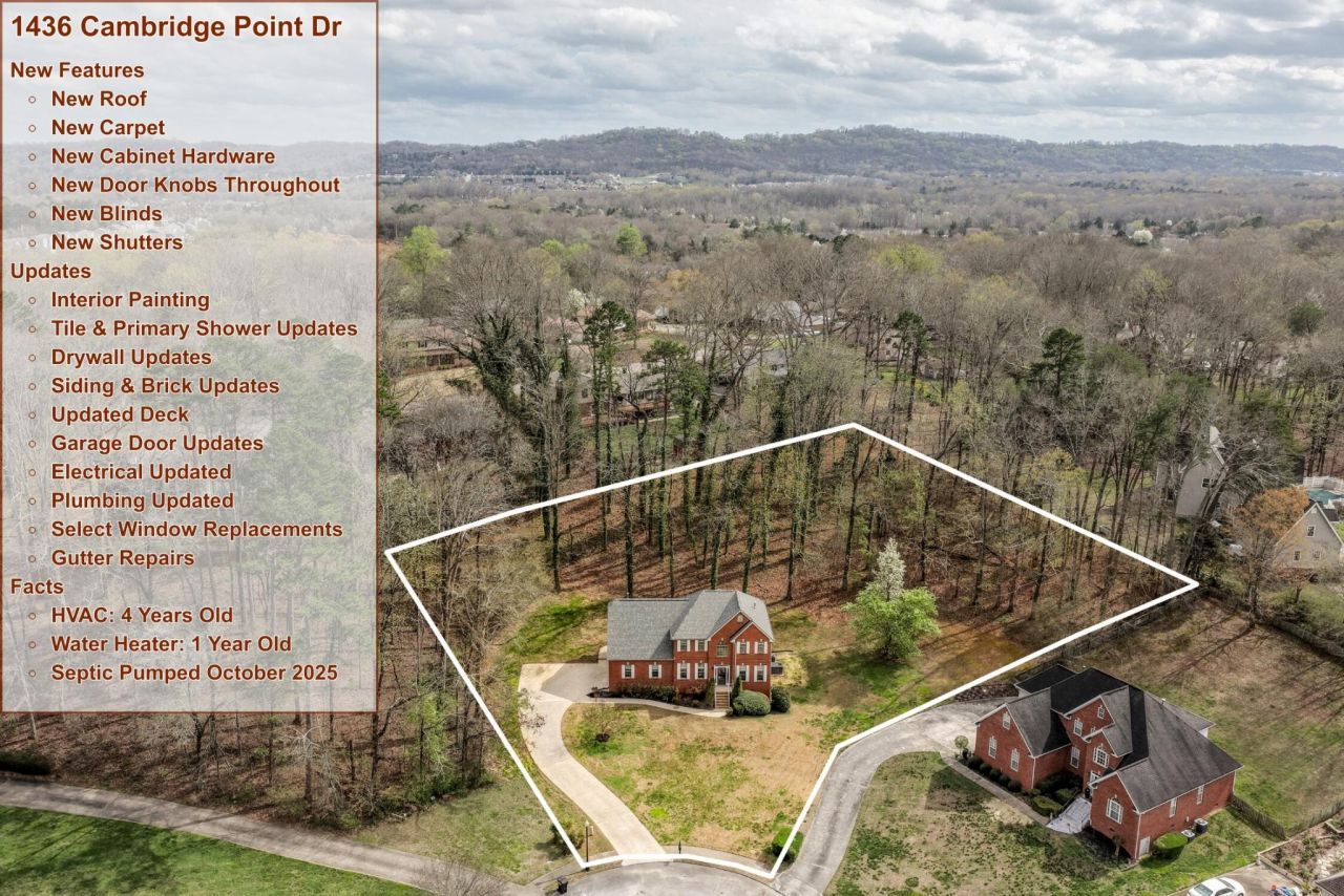 1436 Cambridge Point Dr. is a stately mostly brick 4 bedroom, 2.5 bath home in the heart of Hixson featuring a dedicated study, formal dining area, spacious living room with brick fireplace, and an updated kitchen designed for connection and entertaining. With a private backyard, back deck, two-car garage, and close proximity to shopping, dining, and lake access, this home offers both comfort and convenience in a highly desirable location.Inside, the home offers a thoughtful layout with a separate office space and a formal dining area, providing flexibility for both work and hosting. The spacious living room is centered around a classic brick fireplace and opens directly to the back deck, creating an inviting space for gathering with family or entertaining guests while enjoying views of the private backyard. The updated kitchen features stainless steel appliances, a center island that overlooks the living room for easy interaction, and beautiful bay windows that fill the space with natural light while overlooking the backyard. The layout keeps the home open and functional while maintaining defined living areas.All four bedrooms are located on the second level, creating separation between living and private spaces. The spacious primary suite features treyed ceilings and an en-suite bathroom with separate vanities, a deep soaking tub, a walk-in shower, and a large walk-in closet. Additional highlights include a main-level laundry room with built-in shelving for added storage and organization, along with a two-car garage.The home has also seen extensive recent updates, including new interior paint throughout, new carpet and flooring, new blinds, and several new windows. Major systems have been addressed as well, with the roof replaced in January, the HVAC system just 4 years old, and the water heater only 1 year old. The septic system was pumped 5 months ago with no issues reported, and both electrical and plumbing have been updated for added peace of mind.